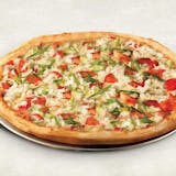 Our secret recipe pizza sauce topped with grilled marinated chicken breast, fresh tomatoes, fresh green peppers, fresh onions, jalapeno peppers and our special blend of 100% fresh natural cheese, sprinkled with fajita seasoning.
